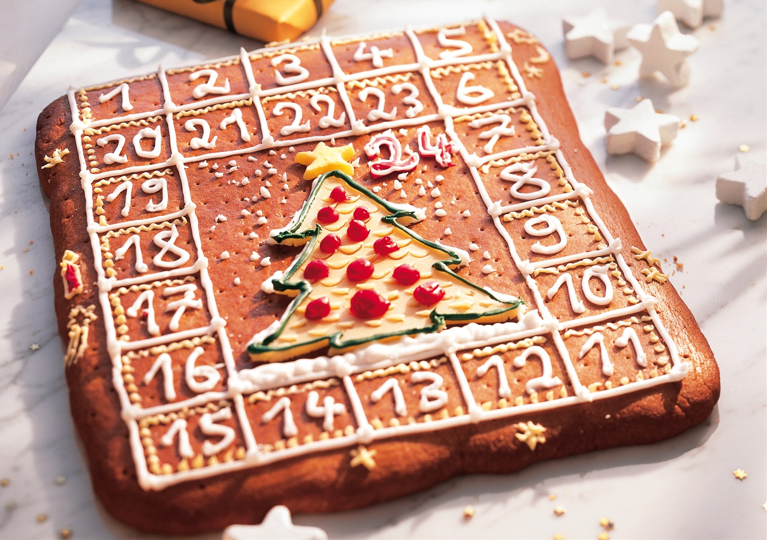 Rechteck in entsprechende Kästchen einteilen, in der Mitte ein größeres Feld frei lassen. Puderzucker sieben, mit Eiweiß zu einer zähflüssigen, spritzfähigen Masse verrühren und einen Teil mit Lebensmittelfarbe einfärben. Mit der Glasur Linien ziehen und Zahlen in die Kästchen schreiben.