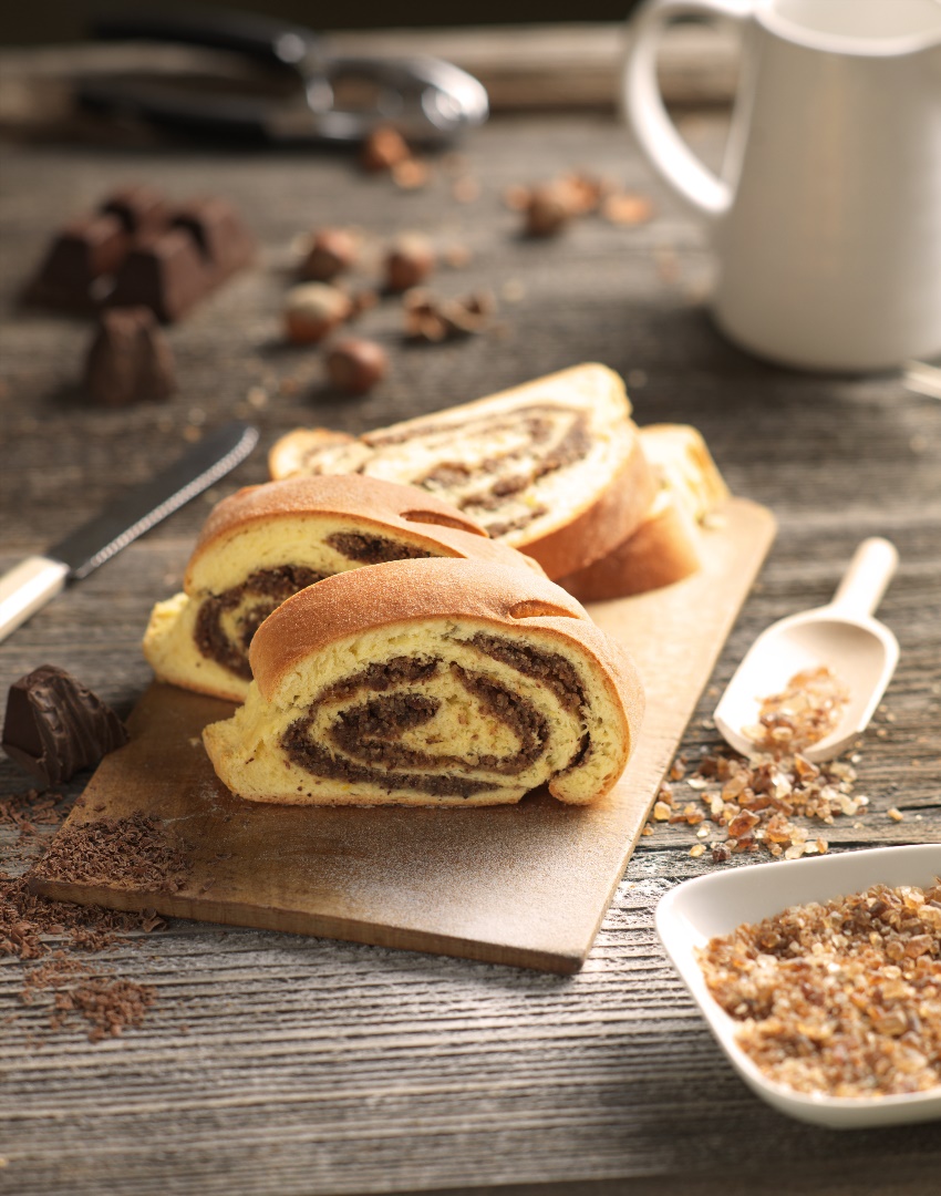Für die Füllung Schokolade reiben. Ei trennen, Eiweiß steif schlagen. Eigelb verquirlen. Haselnüsse, Diamant Grümmel Kandis, Zimt, Schokolade und Eigelb mit heißer Milch zu einem dicken Brei verrühren. Zuletzt Eischnee unterziehen.