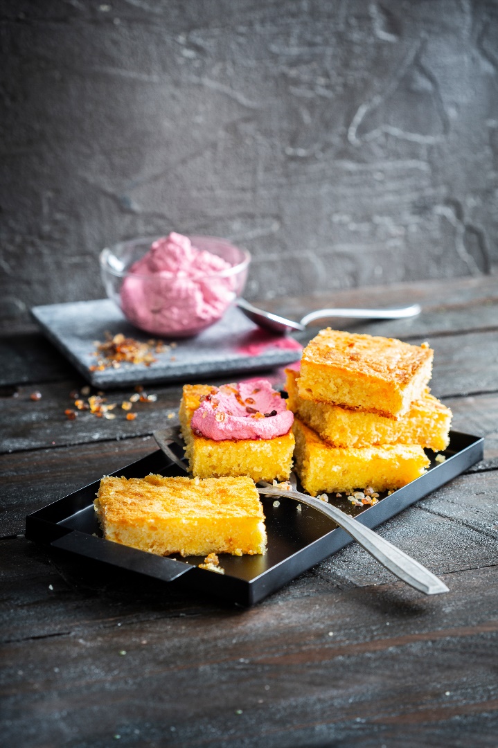 Weiße Schokolade macht aus den bekannten Brownies herrlich saftige Blondies. Mit einem Topping aus Sahne und Rote-Bete-Pulver werden die kleinen Kuchenstücke zum stylischen Hingucker!