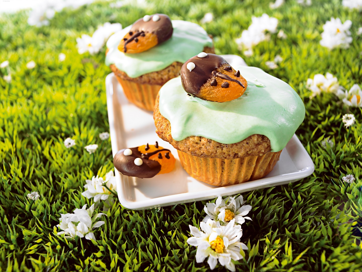 Restliche weiße Kuvertüre mit der Speisefarbe grün färben und Muffins damit bestreichen. Jeweils einen Käfer darauf setzen.