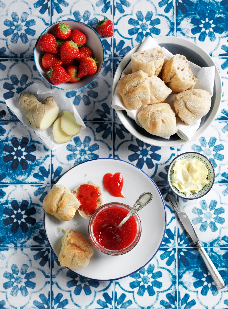Erdbeeren waschen, putzen und in Stücke schneiden. Ingwer schälen und fein reiben.