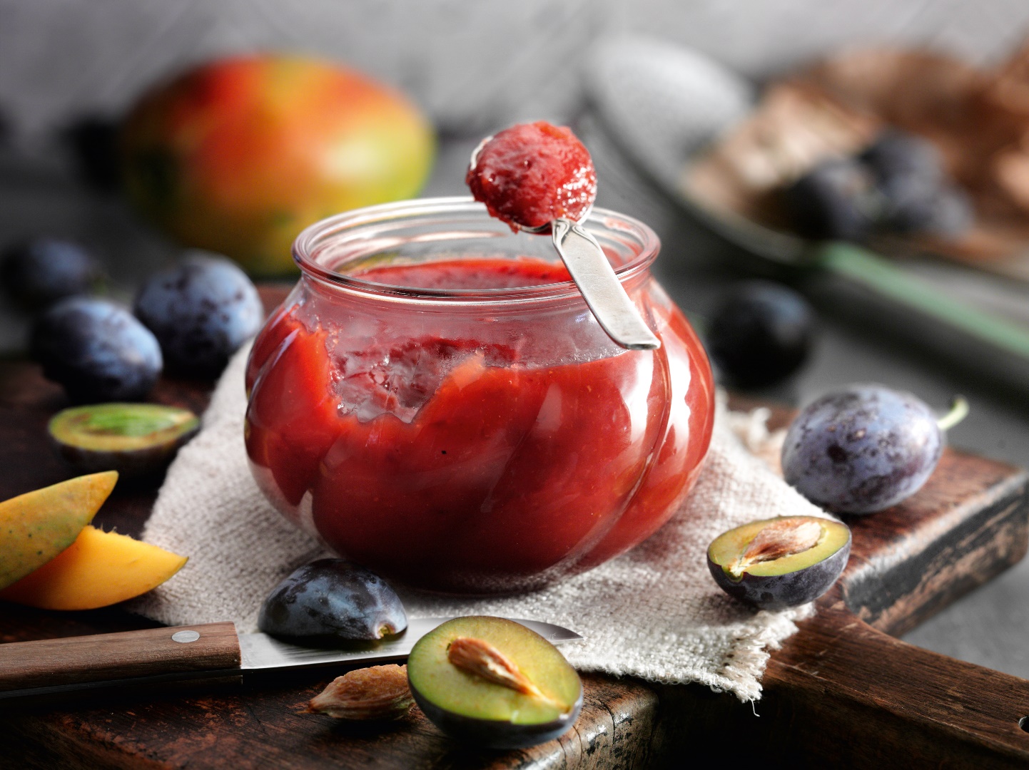 Pflaumen waschen und entsteinen. Mangos schälen und Fruchtfleisch vom Kern schneiden. Obst pürieren und insgesamt 1,5 kg abwiegen.