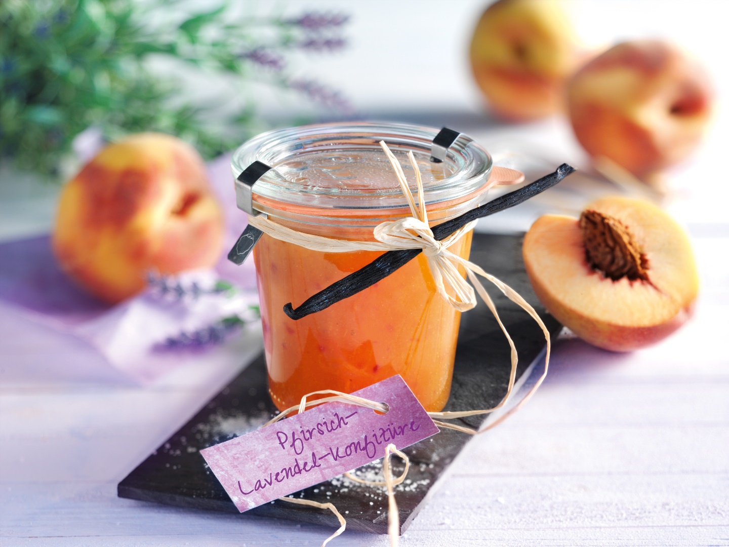 Pfirsiche mit Lavendelblüten, Vanilleschote und -mark sowie Diamant Gelierzucker 1:1 in einem großen Topf mischen und unter Rühren zum Kochen bringen.